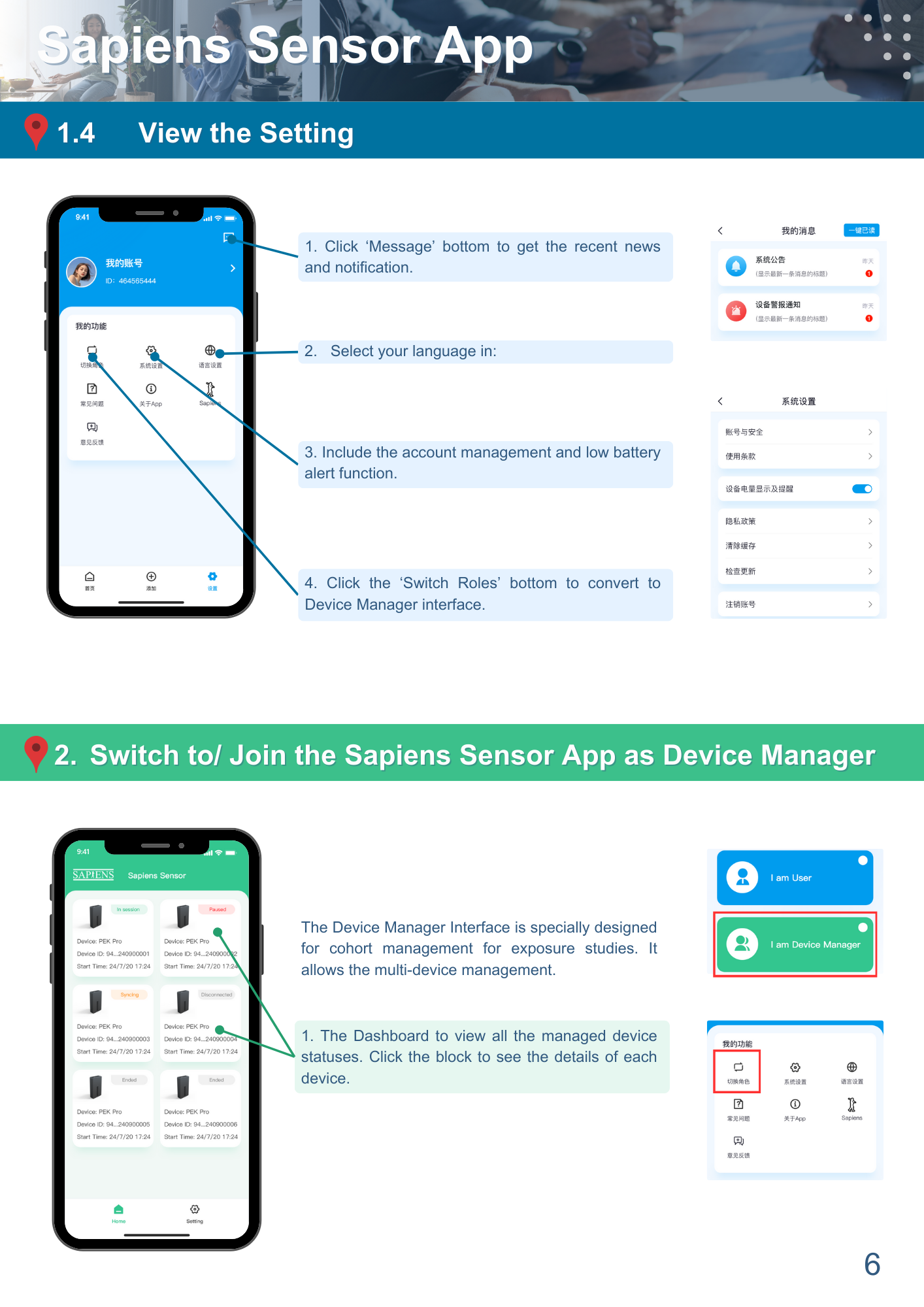 To be compatible with different users’ needs, two modes ‘User’ and ‘Device Manager’ are included. The ‘User’ mode focuses on personal exposure monitoring, while the ‘Device Manager’ mode allows multiple device management for advanced research.